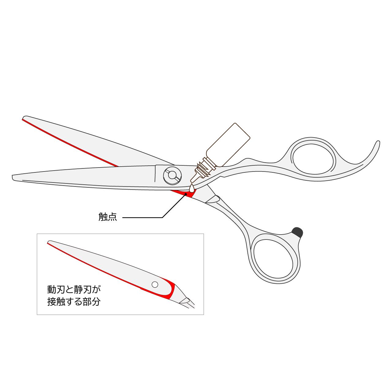 鋏の開閉を滑らかにし、摩耗を抑える為に少量を触点とねじ部分に塗布してください。
